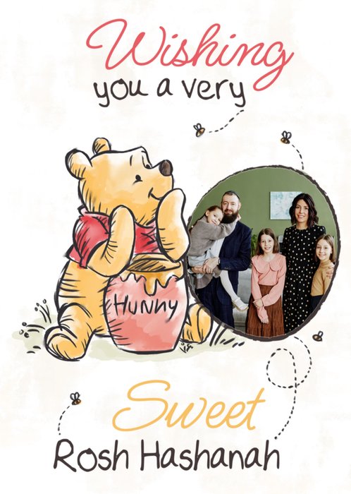 Front of card: Featuring an illustration of Winnie the Pooh With a jar of honey and a circular photo frame. Text reads: "Wishing you a very sweet Rosh Hashanah".