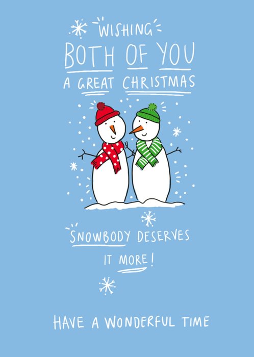 Front of card: Featuring two illustrated snowmen wearing woolly hats and striped scarves with falling snow and star doodles, on a light blue background.