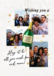 Featuring a starry collage layout of 4 photo uploads with a champagne bottle balloon, all on a white textured background, with black script text.
