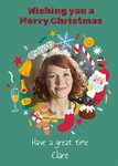 Front of card: Featuring festive themed illustrations circling a photo frame on a green background. Text reads: "Wishing you a merry Christmas have a great time Clare". All text can be personalised!