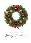 Featuring a traditional green wreath with red ribbon bows, gold and red baubles, holly berries and pine cones on a white background.