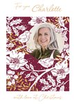 Front of card: Featuring a festive floral two tone print with a circular photo frame. Text reads: "For you Charlotte with love at Christmas". 'Charlotte' can be personalised!