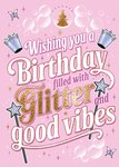 A bright and glittery Glinda themed birthday card, featuring a pink background with sparkling golden text and playful wands. The design includes magical accents like butterflies, bubbles, and fairy-like crowns for a whimsical feel.