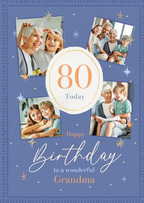A modern, sentimental design featuring a central oval containing a large '80' with a Birthday message underneath, surrounded by 4 rectangular photo frames. The design has scattered stars and sits on a soft blue background.