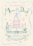A festive and whimsical greeting card for a 70th anniversary, featuring a birthday cake with candles, champagne, and celebratory table decorations in hand-drawn style, all set on a cream background with soft pastel colours.
