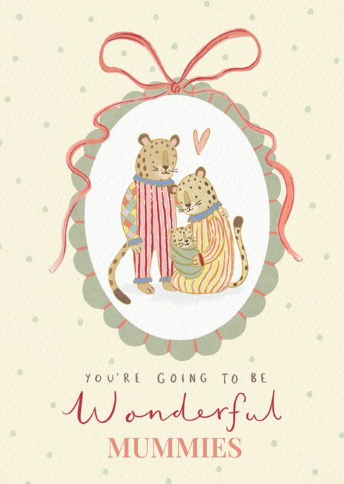 A cute design featuring an illustration of two leopard parents in patterned nightwear cuddling a baby leopard in a blanket, framed in a scalloped oval with a ribbon bow, on a soft cream background.