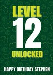"Level 12 unlocked happy birthday Stephen". '12' and 'happy birthday Stephen' can be personalised!