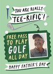 Text reads: "You are really 'tee-rific'! Free pass to play golf all day. Happy Father's Day."