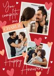 Front of card: Featuring handwritten typography surrounded by hearts with three photo frames. Text reads: "You complete me Charlie happy anniversary". 'Charlie' can be personalised!
