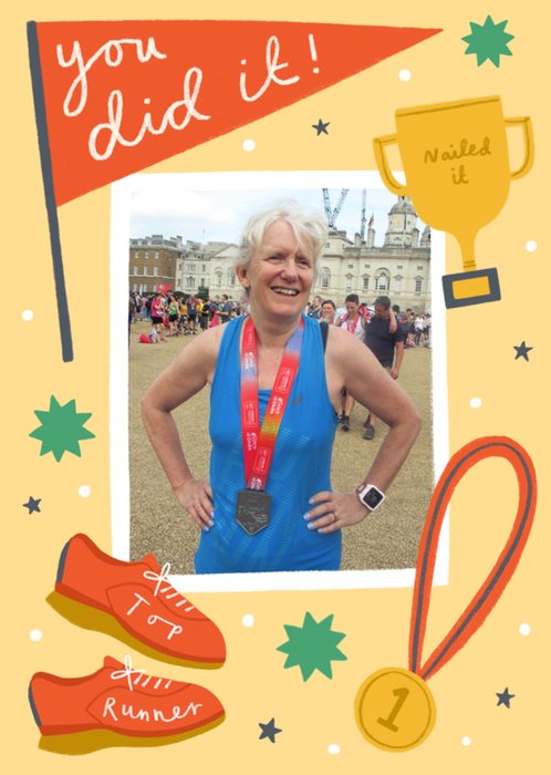 Featuring a rectangular photo frame with a white edge surrounded by illustrated running icons including a trophy and a medal, on a warm yellow background.