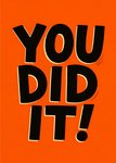 A bold and energetic greeting card with large black block letters outlined in cream on a bright orange background.
