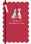 Front of card: Featuring a warm illustration of Perdita & Pongo surrounded by small hearts on a red scalloped background with a vertical ribbon and 'With love' tag.