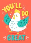 A fun, playful design featuring a cheerful cartoon chicken with teal wings, stars, hearts and bold hand-lettering on a coral background.