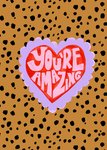 Featuring pink hand lettering, inside a red heart with a lilac scalloped frame on a tan leopard print background.