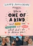 Featuring a heartfelt anniversary message on a soft pink background. The words "ONE OF A KIND," "funny," "BEAUTIFUL," and "lovely" in the sentence are highlighted in different colours and styles, adding emphasis and a playful touch. Small love hearts are scattered around the text, enhancing the romantic and affectionate tone of the card. There are three photo upload areas in a longways photo strip.