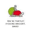Front of card: Featuring a funny illustration of two turtles fornicating. Text reads: "You're turtley f*cking ancient, Dave". 'Dave' can be personalised!