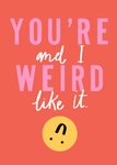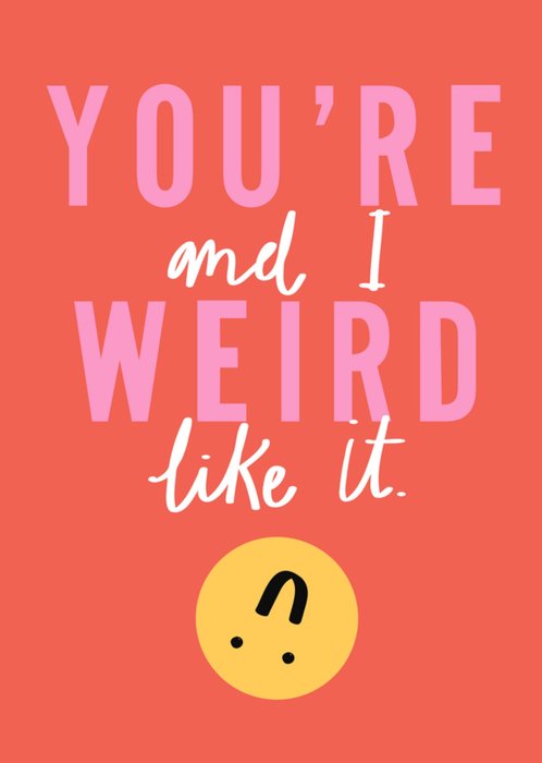 Featuring a mixture of big, bold, pink text and handwritten style white text on a red background. With an upside down smiley yellow face at the bottom of the card.