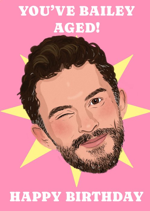 Featuring bold white uppercase lettering at the top and bottom of the design around a large illustrated winking man’s head with dark curly hair and a beard, framed by soft yellow starburst shapes on a bright pink background.