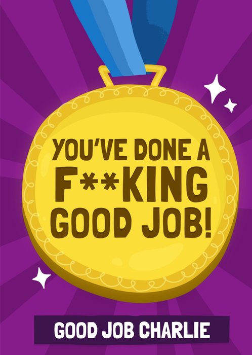 Front of card: Featuring an illustration of a gold medal. Text reads: "You've done a f**king good job! Good job Charlie". 'Good job Charlie' can be personalised!
