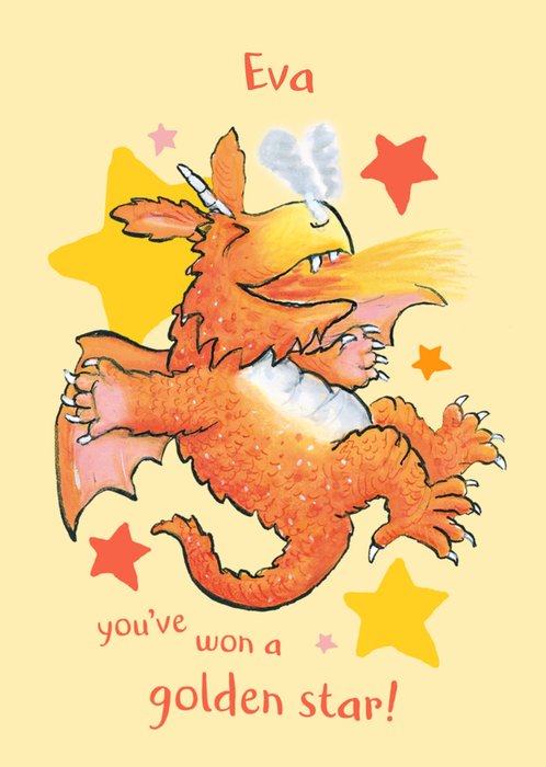 Featuring Zog, an illustrated flying orange dragon breathing out a golden flame, with colourful star shapes on a pale yellow background.