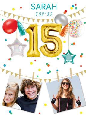 Party Themed Display Of Balloons With Two Photo Uploads Fifteenth Birthday Card