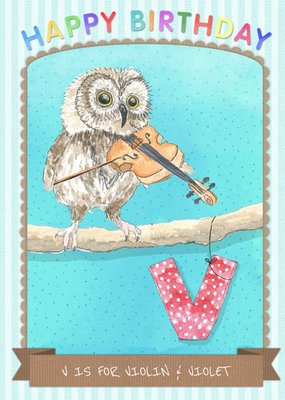 Pinstriped V Is For Violin And Personalised Name Happy Birthday Card