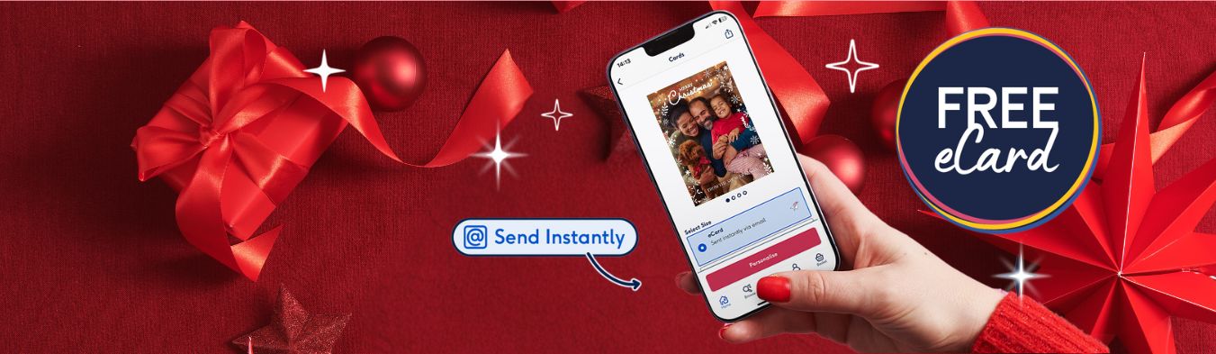 Make them feel extra special this Christmas with a free personalised Christmas eCard. Left it until the last minute? No problem — choose an eCard and deliver your Christmas wishes instantly. Just like our physical Christmas cards, you can personalise your eCard with photos, stickers and festive emojis to create something truly meaningful. Find the perfect free Christmas eCard online and spread holiday cheer in just a few clicks 🎄