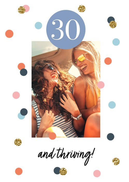 This 30th birthday greeting card features bold numerals in a circular design at the top, accented with playful pastel and gold glitter confetti scattered across a white background, with the phrase “and thriving!” written in an elegant cursive font at the bottom, creating a festive and upbeat atmosphere. There is one photo upload area in the centre in a rectangular frame.