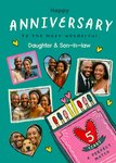 Front of card: A modern, humorous Anniversary Card featuring an illustration of a box of matches on a green background. There are 5 mixed shape photo upload frames scattered around the illustration. Text reads: "Happy Anniversary to the most wonderful Daughter & Son-in-law. 5 years a perfect match".