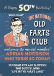 50th Birthday Card For Men - Happy 50th Birthday! The national old farts club welcomes it's newest member! Adrian Morrison who turns 50 today! Fetch his pipe and slippers! This dude's living "life in the fart's lane!" "More cocoa?"