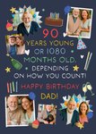 "90 years young or 1080 months old, depending on how you count! Happy Birthday Dad!".