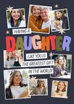 Front of card: Featuring 8 photo upload frames at the top and bottom of the card, on a dark blue background surrounded by stars. In the centre of the card amongst the photo uploads is text with the word 'Daughter' in bold colourful text.