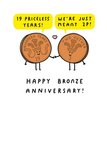 Front of card: Meant To Be! 19th Anniversary Funny Pun Card Cartoon Illustration of a pair of two pence pieces. Text reads: "19 priceless years! We're just meant 2p!" and "Happy bronze anniversary!"