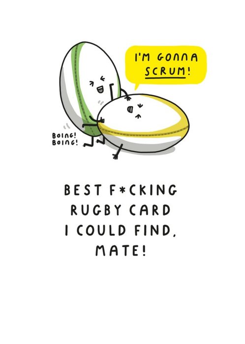 Front of card featres a Moonpig dressed in a rugy shirt and standing on a rugby ball.