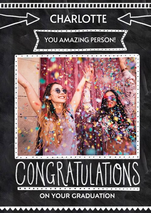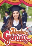 A bold and celebratory greeting card with a large rectangular photo area featuring a graduate in cap and gown, framed by swirling retro-style waves in red, orange, and yellow against a pink background.