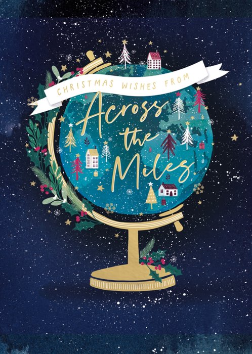 Featuring an illustration of a festive globe with foliage, trees, houses, snowflakes, presents, stars, holly & mistletoe on the background of a starry night sky with gold script effect text on a white ribbon wrapped around the top of the globe and also in the centre of the globe.