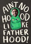 A bold and fun Father's Day card featuring a single illustrated figure in a green hoodie with a photo upload face, set against a dark textured background. Large, playful text reads “Ain’t no hood like fatherhood!” — making it a cheeky, light-hearted way to celebrate dad and all his parenting greatness.
