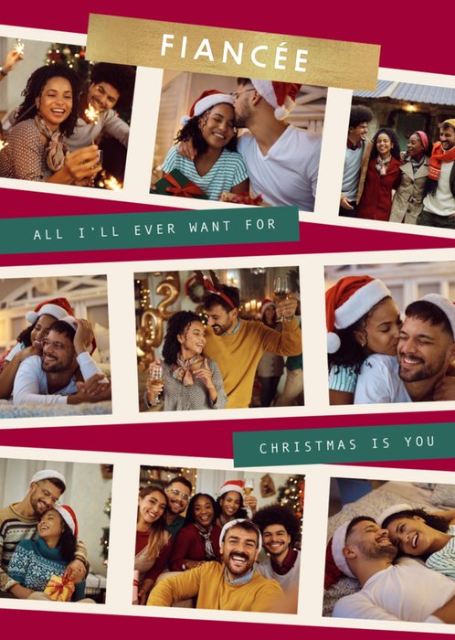 Featuring eight rectangular photo upload frames arranged in a modern collage layout. The top section includes the word “Fiancée” on a gold banner, with additional text on green banners separating the photo rows. The design includes a deep red background adding a festive and romantic tone.