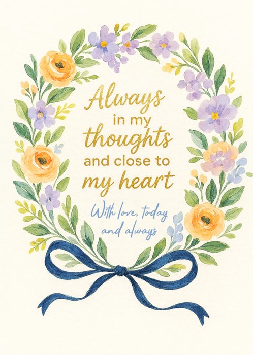 Featuring a watercolour floral wreath with yellow roses, small purple flowers, green leaves, and a blue ribbon bow at the bottom on a greeting card, set on a cream background.