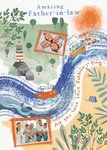A scenic and artistic Father's Day card featuring a hand-painted coastal landscape with a striped lighthouse, boats on swirling waters, trees, and foliage. The card includes two framed photo upload frames, making it personal and family-oriented. The overall design has a warm, nostalgic summer feel with a creative use of mixed media illustration.
