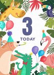 Floral framed card featuring animals wearing party hats and holding balloons, a giraffe, bear, crocodile and toucan. Customisable text is in the center of the card. The number can be changed. Text reads: "3 Today"
