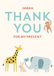 Featuring bold thank you typography with cute animal illustrations, including a giraffe, elephant, rabbit and monkey, all on a cream coloured background.