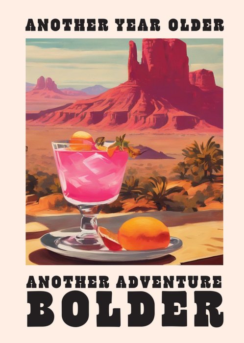 Front of card: Featuring a vibrant desert scene, in the foreground, there is a refreshing pink drink in a glass filled with ice and garnished with a slice of citrus fruit. Text reads: "Another year older another year bolder".