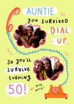 "Auntie, you survived dial-up, so you’ll survive turning 50! Easy peasy!" "Auntie" & "50" are editable.