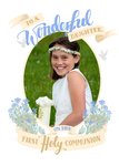 Front of card In the center of the card there is an photo upload oval. Above text reads: 'To a wonderful daughter' and below, 'On her first Holy Communion'. Text is written over banners framing the photo upload oval. Blue and pink flowers are bursting out of either side of the bottom banner.