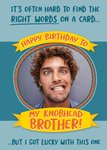 Text reads: "It's often hard to find the right words on a card... but I got lucky with this one. Happy birthday to my knobhead brother!".