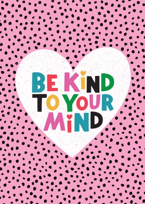 Featuring a large white heart with bright multicolour typography on a black and pink spotty background.