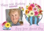 "Happy 90th Birthday Mammy, Enjoy Your Special Day" Card also has a photo upload frame on the left hand side next to the teapot.