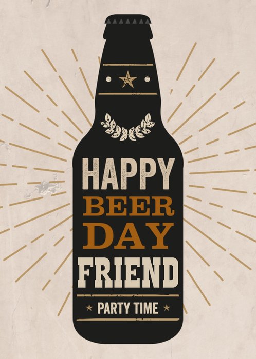 Featuring a large beer bottle graphic with simple star and laurel decorations, radiating gold lines, on a beige coloured background.