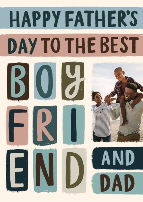 A heartfelt and contemporary Father's Day card featuring blocky hand-painted typography in warm, muted tones. A photo upload frame sits alongside the grid-style text, offering space for a personalised picture. The layout and colour palette make this a stylish way to celebrate a partner who is both an amazing boyfriend and an incredible dad.